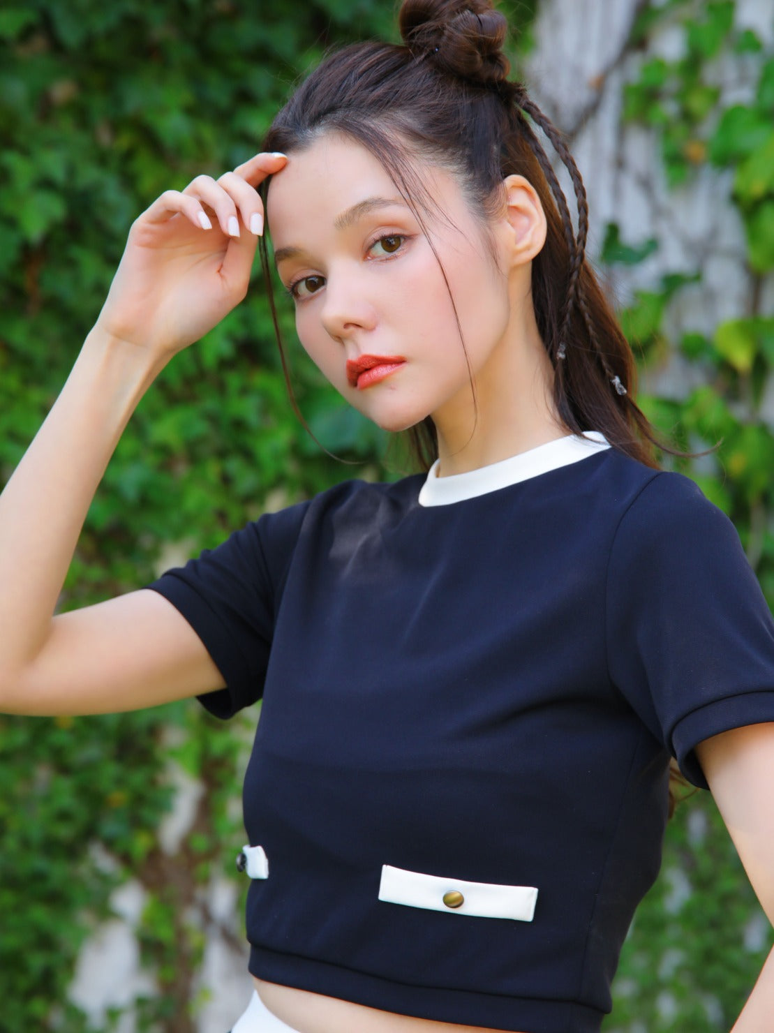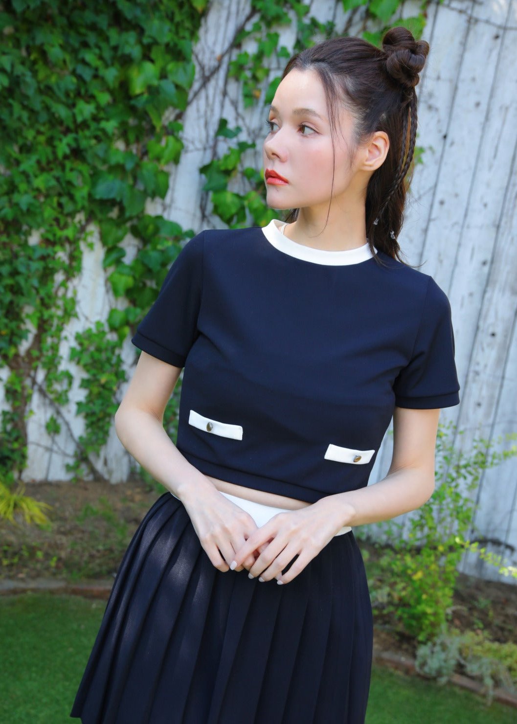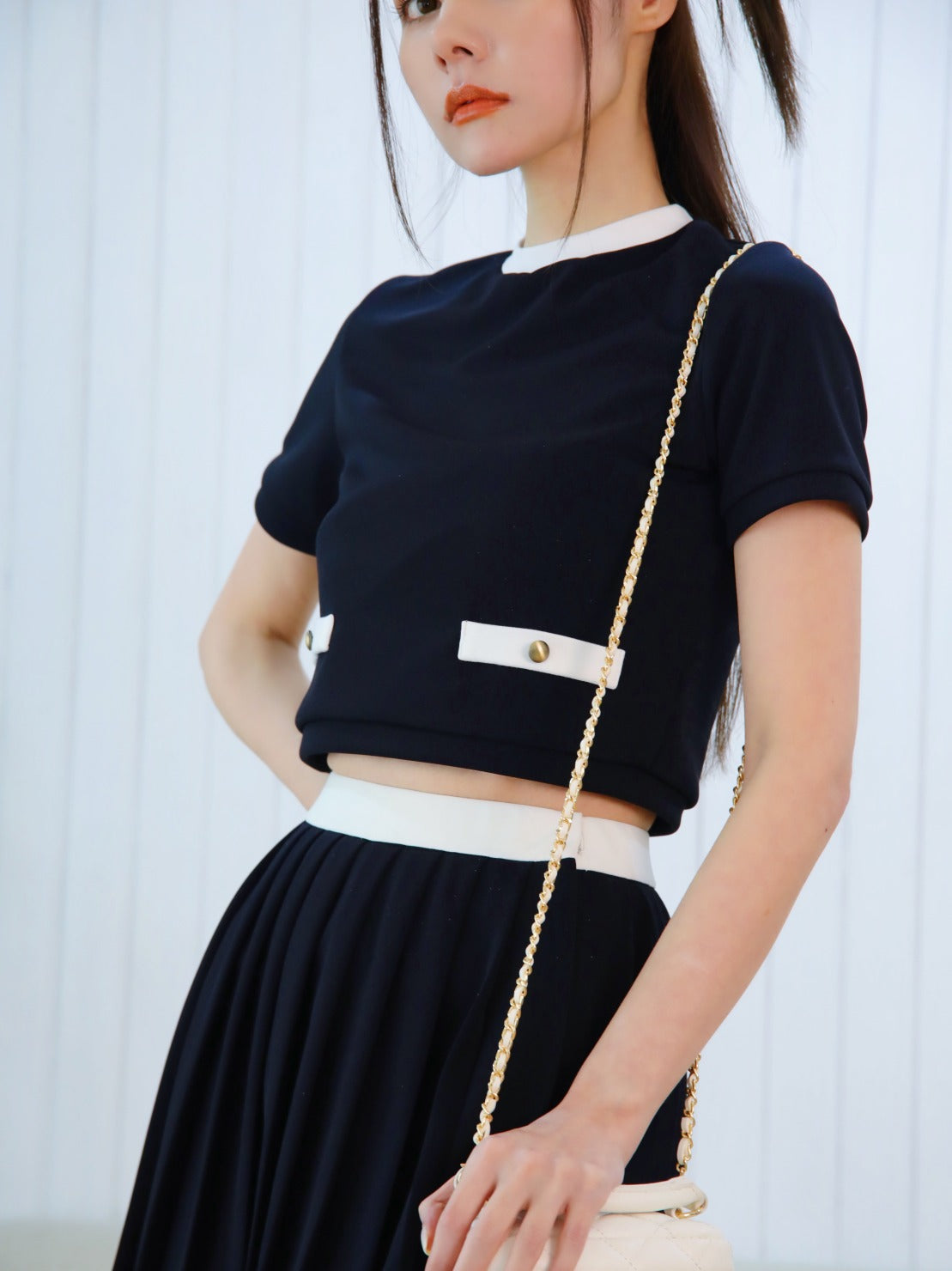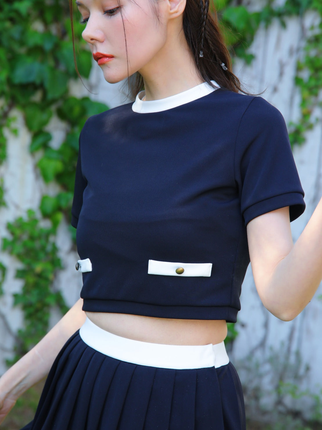 フェイクポケット付きのクロップド丈トップス。シンプルなデザインで様々なボトムスとのMIXコーディネートが楽しめます。プリーツスコートとセットで着用すると綺麗にまとまった印象のコーディネートに仕上がります。