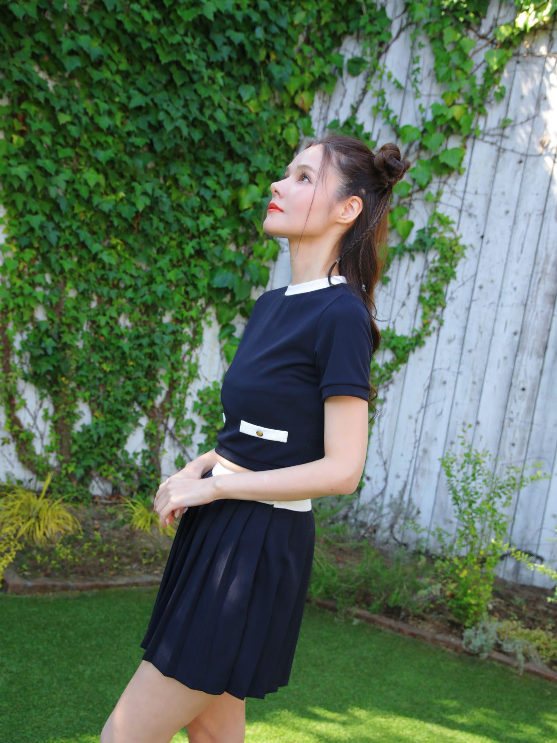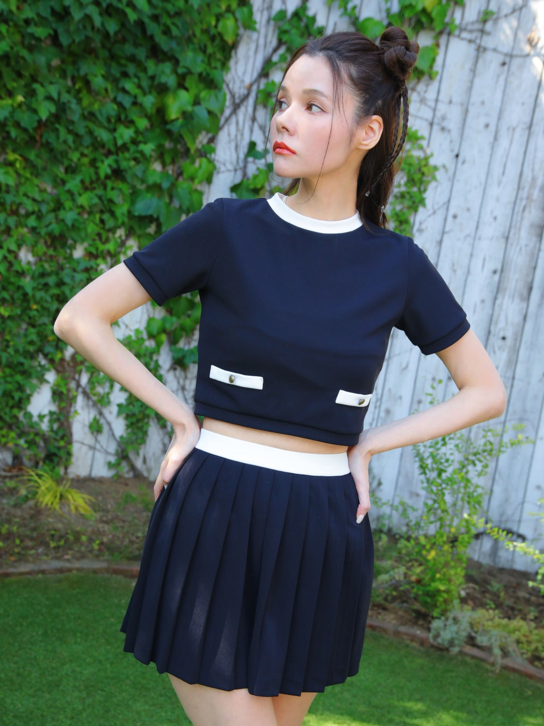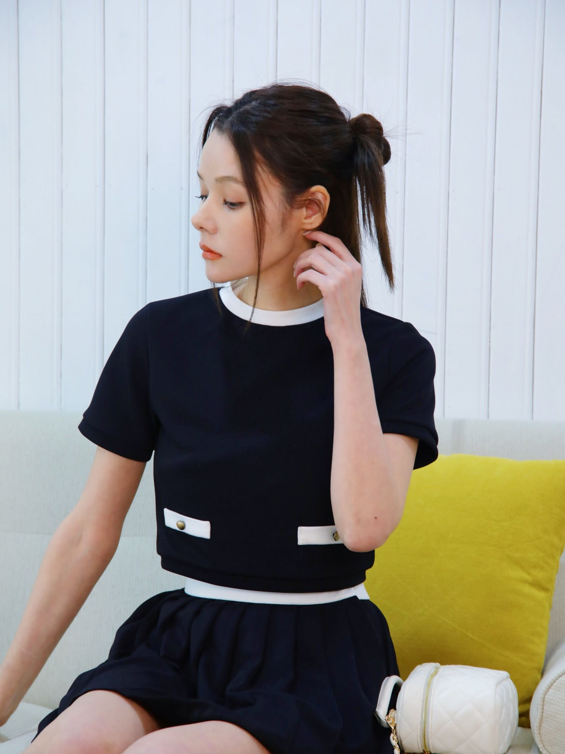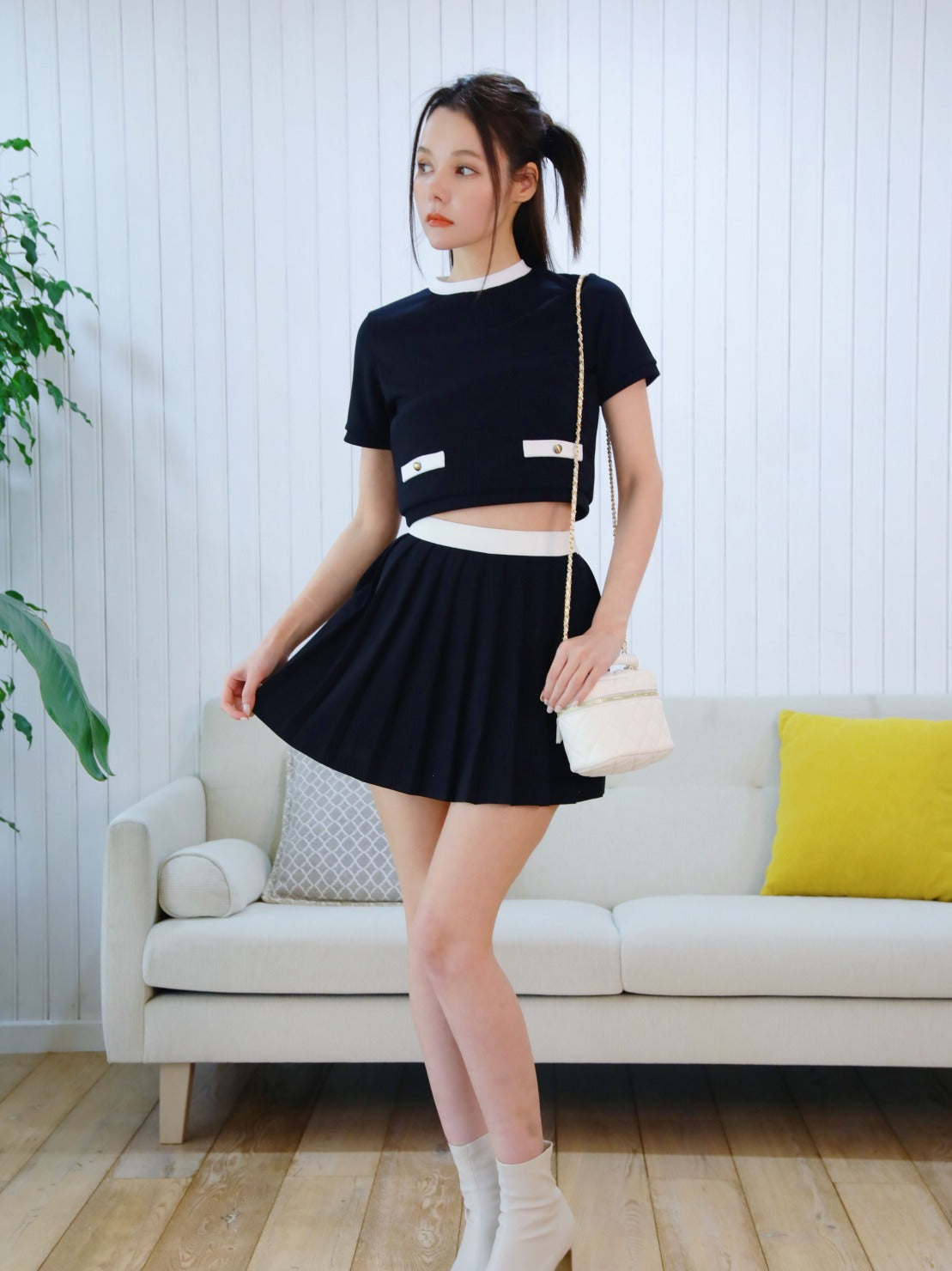 フェイクポケット付きのクロップド丈トップス。シンプルなデザインで様々なボトムスとのMIXコーディネートが楽しめます。プリーツスコートとセットで着用すると綺麗にまとまった印象のコーディネートに仕上がります。