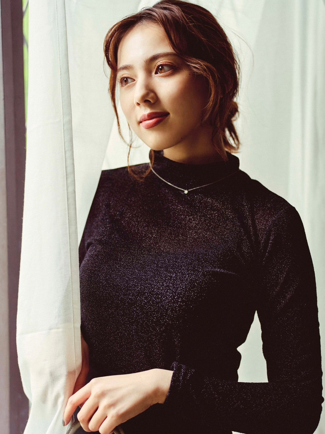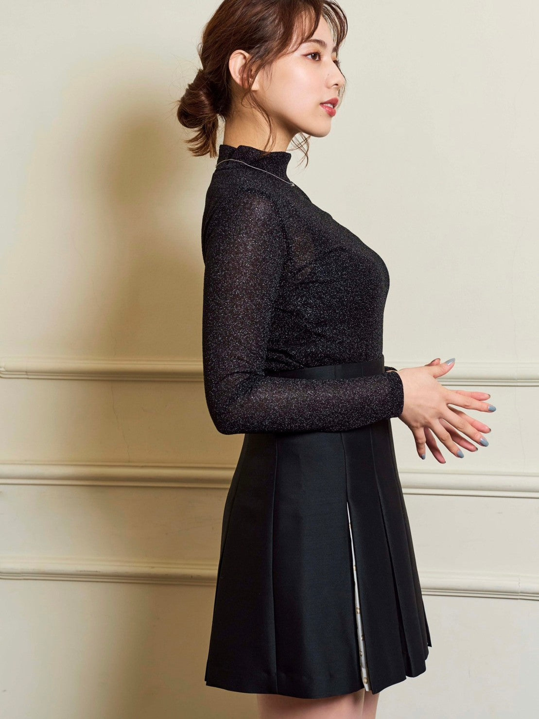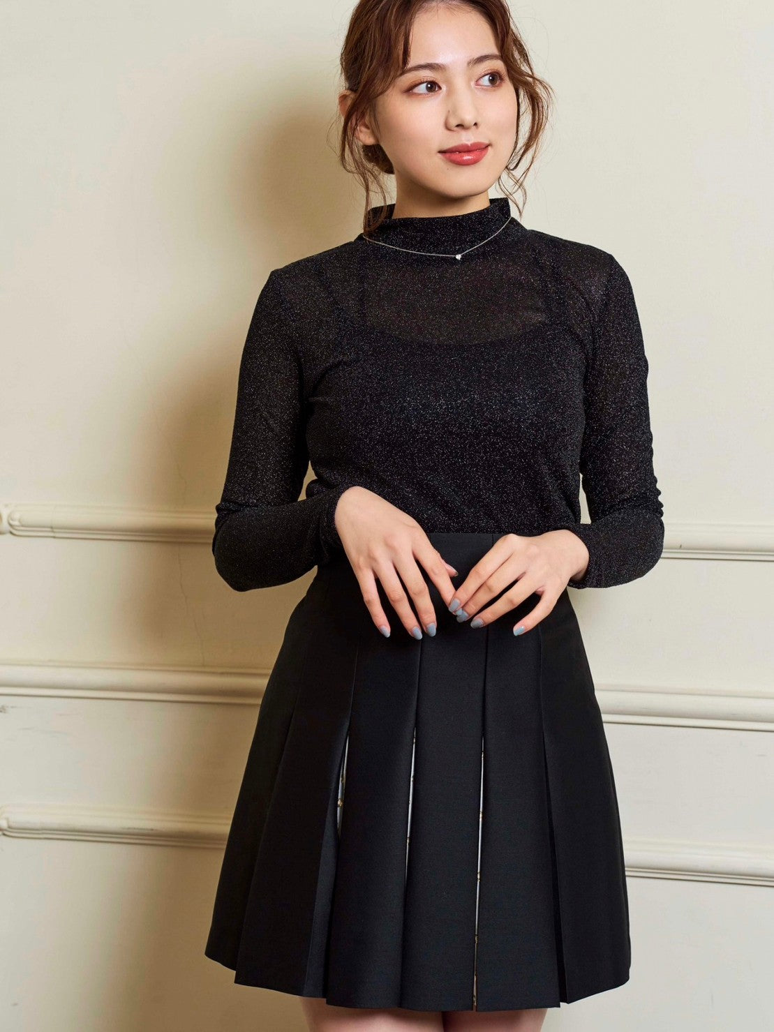ラメ使いが華やかな、ハイネックのカットソー。やや透け感のある素材でトレンドも取り入れつつ、シンプルなデザインにこだわりました。程よくフィットするシルエットで、単品ではもちろん、ジャケットやカーディガンのインナーとしても活躍します。すっきりとしたスタンドカラーはレイヤードしやすく、コーディネートの幅が広がります。薄手の素材なのでロングシーズンお使いいただけるトップスです。